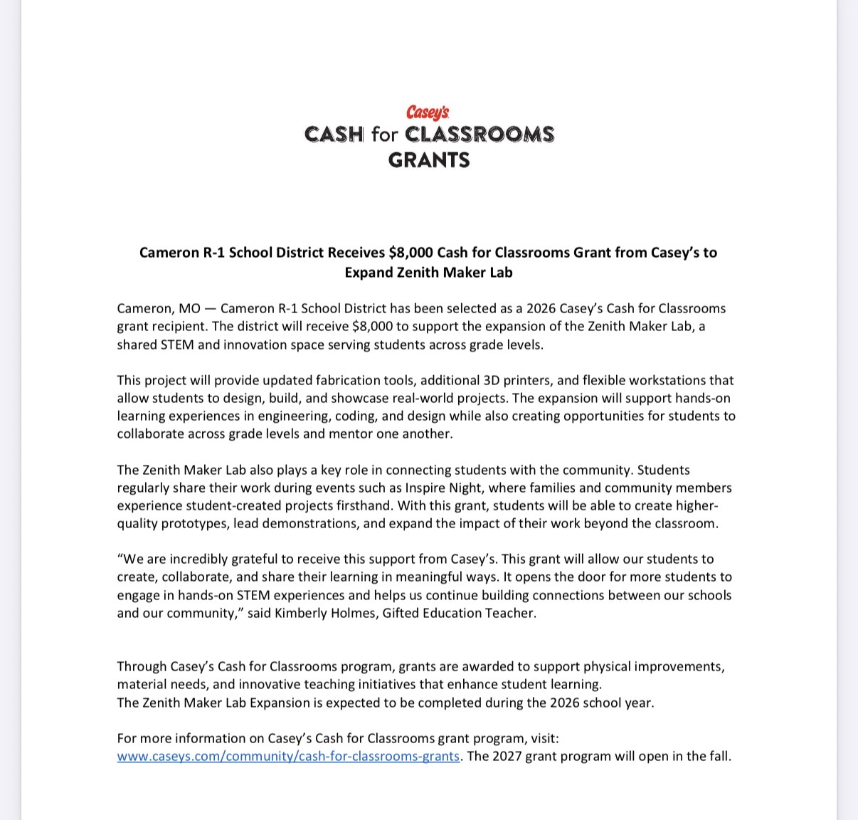 Congratulations to Mrs. Kim Holmes and our Zenith Gifted Program! Mrs. Holmes applied for - and was granted - the Casey's "Cash for Classrooms" Grant for $8,000!! Thank you, Casey's, for continuall...